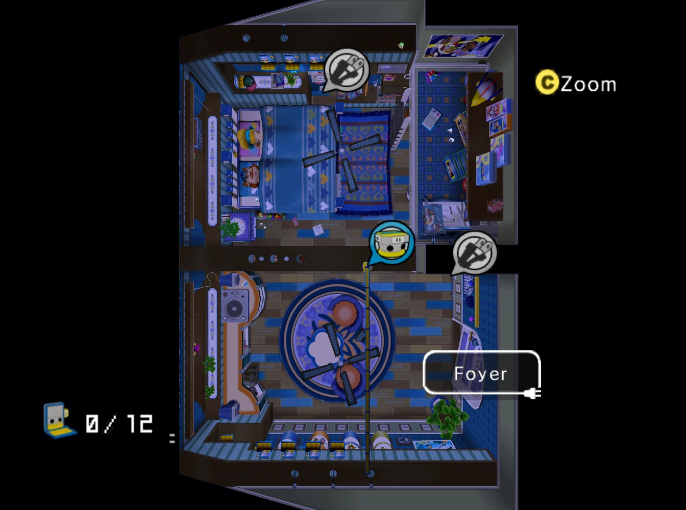 Mr. and Mrs. Sanderson's Bedroom, is where Mom spends her time balancing checkbooks. It's home to Dinah and Funky Phil. It contains a flower bed for the Nectar Flower and a locked case holding Giga-Robo's leg. It features the most Chibi-Doors in any room.