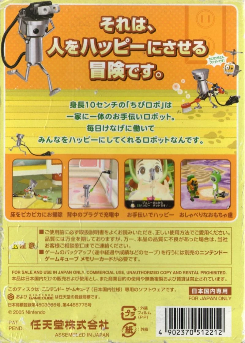 Chibi-Robo! Plug Into Adventure! is the first game in the Chibi-Robo! series, and was first released for the Nintendo GameCube in Japan in 2005. It was developed by Skip Ltd. and published by Nintendo. It became a part of the New Play Control! series in Japan for Wii on June 11, 2009. The main objective of the game is to earn Happy Points by making people happy, and eventually become the best Chibi-Robo.