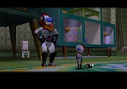 Even though the family is in a critical financial situation, they celebrate Jenny's birthday with Chibi-Robo and Telly Vision. Night eventually comes and the family goes to sleep (Mr. Sanderson being forced to sleep on the couch as Mrs. Sanderson is still mad at him), while Chibi-Robo goes off to explore the house. He and Telly Vision soon find out that all the toys around the house can move and talk, but only when humans aren't around. Chibi-Robo befriends them and starts helping the toys out with their troubles. His adventure around the Sandersons' house continues. Eventually, Chibi-Robo finds a large robot in the basement with a missing leg called Giga-Robo, who was once a companion of the Sandersons, but had to be deactivated due to its high electricity consumption. Chibi-Robo attempts to revive Giga-Robo by fully charging its massive battery using the Giga-charger and makes it a goal to find Giga-Robo's missing leg, but is attacked by spider-like robots called Spydorz.