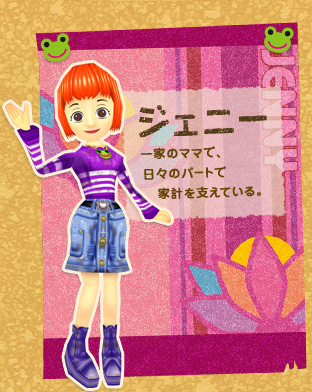 Jenny is a fun-loving girl that enjoys drawing and coloring, which she is usually seen doing in the living room of the house. She is very friendly and enjoys Chibi-Robo's company, always saying hello to him and giving him a kiss if he brings her any Frog Rings. She also asks for his help throughout the game, as she is at odds with her family due to her "frog curse" and doesn't communicate well with them. The sound she makes is the Japanese onomatopoeia of a frog's croak: "gero, gero".